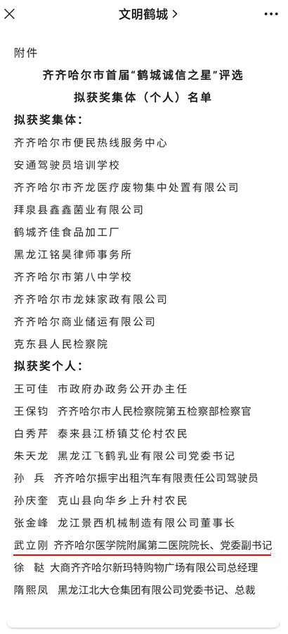 近日,齐齐哈尔市举办了首届“鹤城诚信之星”评选活动,十佳诚信集体和十佳诚信个人评选已经揭晓。齐医附属二院院长、党委副书记武立刚荣获齐齐哈尔市首届“鹤城诚信之星”荣誉称号。