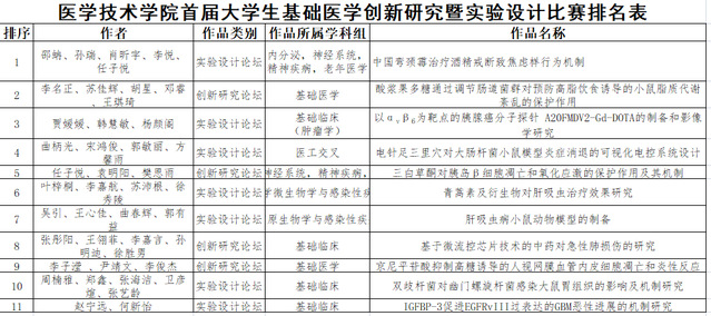 本次比赛在线上通过参赛团队PPT答辩方式进行,汇报团队经过精心的准备,答辩过程十分精彩。评委们从项目内容(选题、结果、结论或项目可行性、创新性、实用性),汇报答辩(PPT、表达、逻辑、回答问题、基础知识)、团队合作三个大的方面对学生进行了评价和全方位细致的指导。经过激烈角逐,由邵蚺、孙瑞、肖昕宇、李悦、任子悦组成的团队申报的实验设计类作品《中国弯颈霉治疗酒精戒断致焦虑样行为机制》排名第一(其他排名情况见图1)。本次比赛的11个作品将全部推荐到学校参加校级大学生基础医学创新研究暨实验设计论坛。