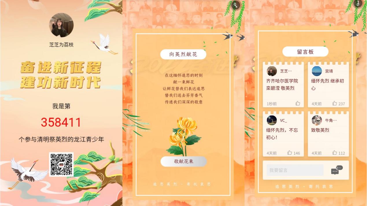 组织学生参加由共青团黑龙江省委员会组织的“2022·奋进·网上祭英烈”互动打卡活动。通过线上献花、擦拭纪念碑、“云打卡”各地红色纪念馆等方式,组织学生接受线上“沉浸式”精神洗礼,缅怀革命先烈,弘扬英雄精神。