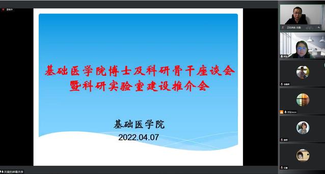 为推进基础医学共享科研中心建设,提升学科科研水平,为开展研究生教育打下坚实基础。4月8日,基础医学院在线召开博士及科研骨干座谈会暨科研实验室建设推介会。会议由林岩院长主持,学院研究室主任、教研室主任、博士人员及科研骨干教师等参会。
