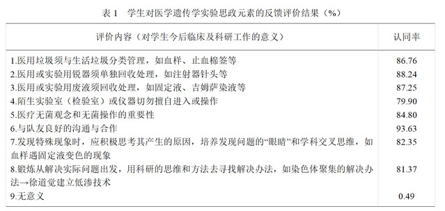 如表1所示,8项评价项目认同率在79.90%至93.63%之间,它们均是教学内容本身蕴含的思政元素,这些思政元素以讲→做(第1项至第6项)和讨论→思考(第7项和第8项)的形式融入,如垃圾的分类管理、锐器和废液的单独回收是以教师讲述为开始,以学生实际行动为结束,让学生对潜在危险有预见性,并知道如何处理;染色体聚集是无法进行染色体核型鉴定的,这曾经是影响细胞遗传学发展的最大障碍,教师以“用什么方法能让人们观察到分散的染色体”作为学生讨论的问题,引导学生想到用生理学的方法让细胞变大,最终引出遗传学家徐道觉建立低渗技术的艰辛历程,锻炼学生从解决实际问题出发,用科学的知识和方法寻找解决办法。