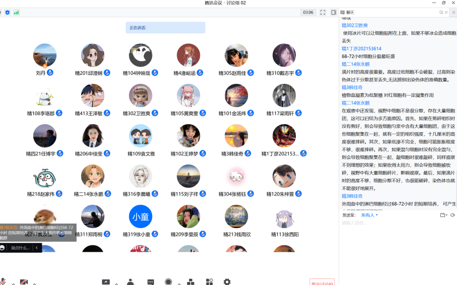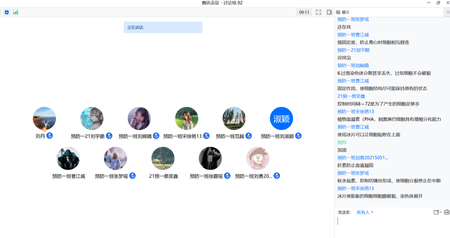教师在第一次实验课结束时发布实验讨论题目,请同学们课下自学,第二次实验课时教师应用腾讯会议分组讨论功能进行随机分组讨论,让学生在讨论组里畅所欲言,互相交流,互相指正。所有授课教师进入讨论小组进行巡视与观测,对积极发言的同学点赞、加油,对不活跃的讨论小组进行督促和引导。(见下图)