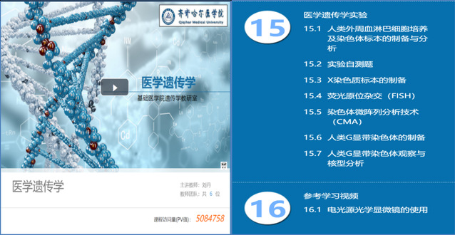 在超星学习通建立医学遗传学MOOC课程(如下图),设置实验专栏第15、16章,包含实验视频、测试题及扩展实验视频资源。讨论结束后,让同学们进入MOOC课程自行观看以上相关视频,做好自测题。返回直播课堂后,教师会根据学生答题情况一一点评,实现实验课程“预习→听课→操作→结果→讨论→测试→作业”闭环式学习。