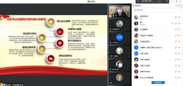 讲座中,佡思维为大家讲解了十九届六中全会精神,强调青年团员要紧紧围绕在党中央的领导下,加强思想政治引领,提高思想政治认识,以高标准严格要求自己。牢记“四个自信”,谨记习近平总书记对新时代青年的六点要求。最后,嘱咐同学们校园静态管理期间,要严格遵守学校各项规章制度,大家共同努力,共克艰难,同时,勉励大家,要在学习上更加刻苦努力,要勇于钻研,在生活上,要谨记共青团员的要求,养成勤俭节约的好习惯,争做时代新青年。