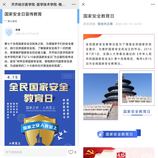 2022年4月15日,是第七个全民国家安全教育日,为全面贯彻落实习近平新时代中国特色社会主义思想和党的十九届六中全会精神,深入学习贯彻总体国家安全观,推动国家安全宣传教育工作深入开展,增强广大师生国家安全意识,医学技术学院开展了多种形式的宣传教育活动。