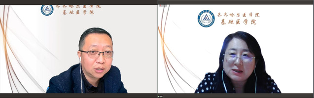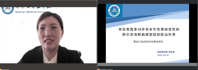 姚宏波副教授依托黑龙江省自然科学基金个人科研项目进行汇报交流,以《双氢青蒿素对伴有老年性黄斑变性的阿尔茨海默病模型鼠的防治作用》为题,汇报了国外访学经历、课题申请经验、主要研究思路,分享了研究成果,并就临床问题,提出假设,确定了老年性黄斑变性与阿尔茨海默病的关联研究,提出了基础与临床科研合作的切入点以及实质性研究。讲座结束后,沈雷、董韬、刘丹阳和张萌等与会教师与姚宏波副教授就阿尔茨海默病与黄斑变性的基因检测、多组学问题、动物模型等进行了深入交流。