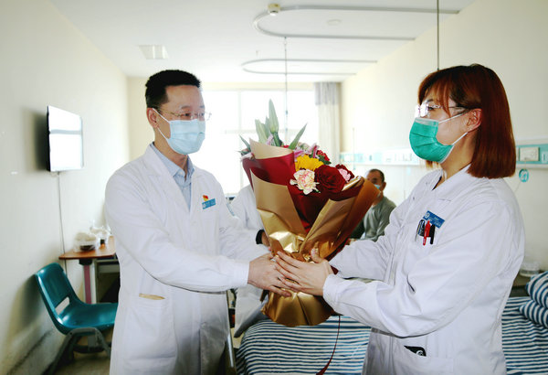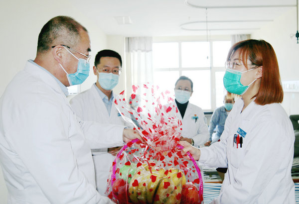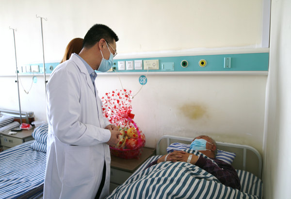 4月27日下午,院长武立刚、副院长鲍红光、赵玉环带领办公室主任耿峰、党办副主任多天娇、工会主席郭春晓携带鲜花、水果等慰问品来到内科病房楼,看望慰问援哈医疗队员刘玉宝的岳父,向队员患病家属送去院里的关怀和温暖。