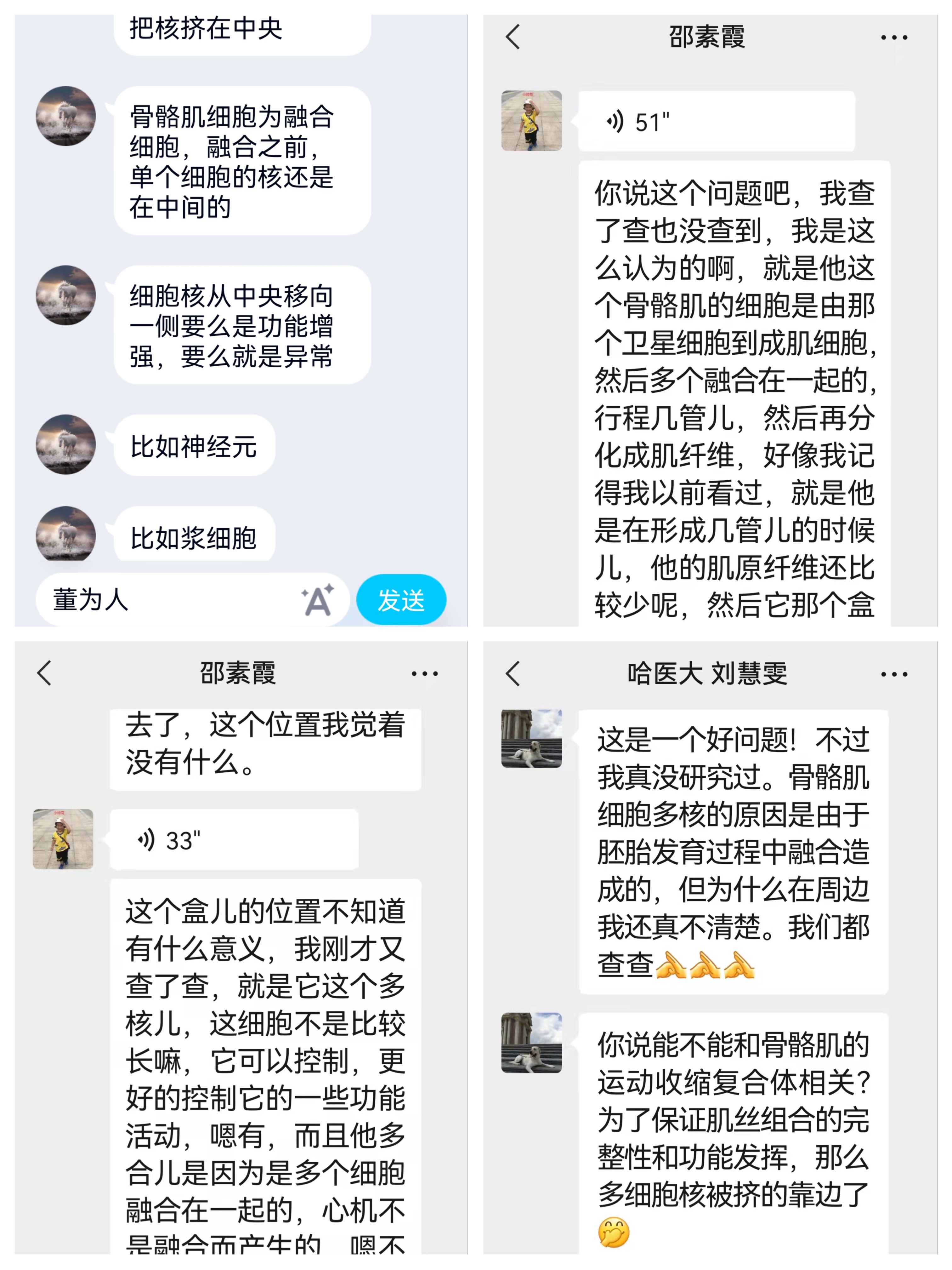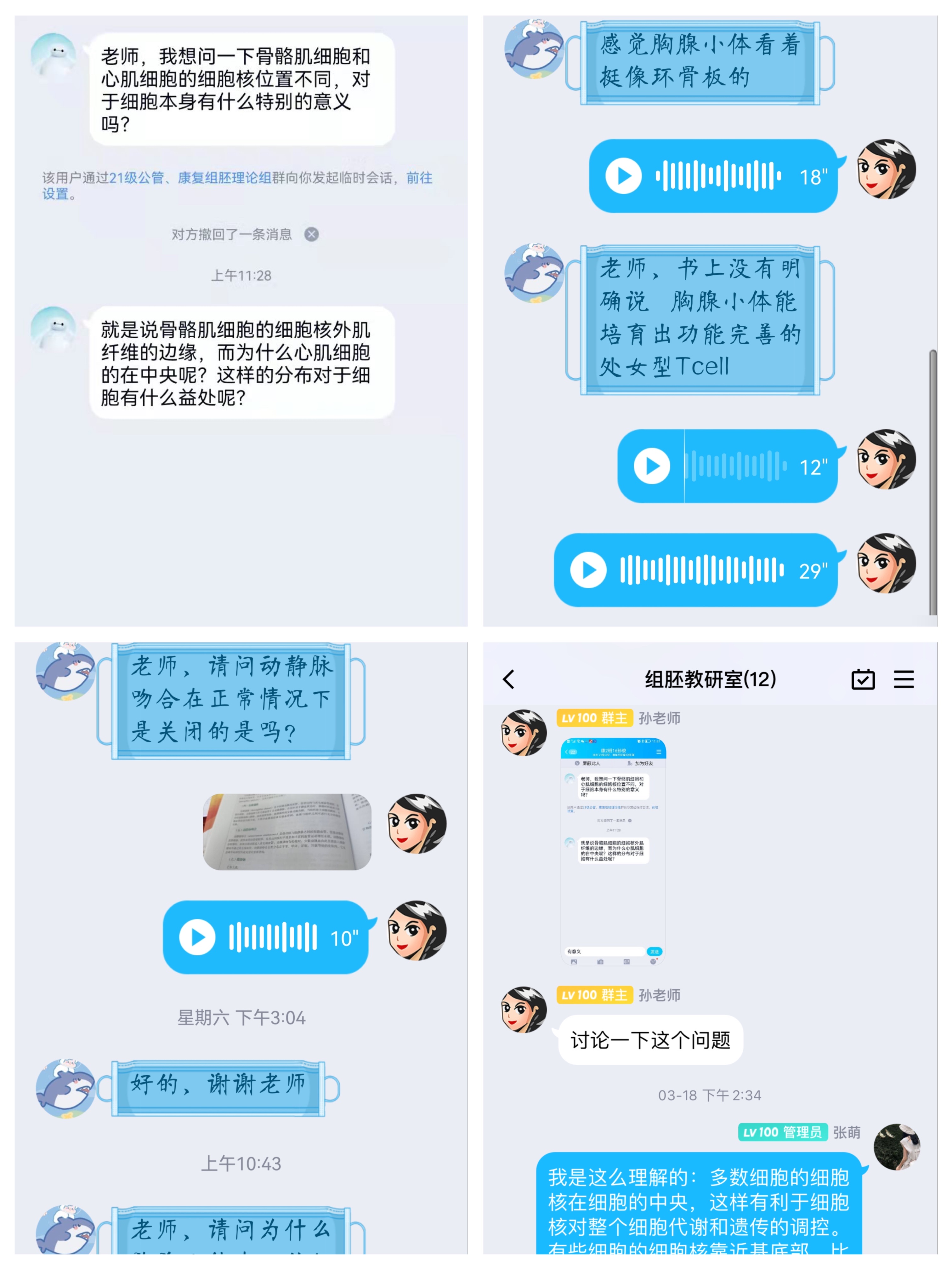 组胚教研室教师依托QQ群、超星学习通平台,利用网络没有时空限制的特点,发挥全过程的师生互动和生生互动。课前,教师通过学习通平台讨论区,了解学生预习情况;课中,教师依托学习通平台进行选人提问与抢答,调动学生的学习积极性;课下,教师通过QQ群针对学生提出的问题给予了详细的解答。有些学生通过积极思考提出的问题具有一定的深度和广度,教师们针对这些问题查阅文献、集思广益,展开了学术讨论。除此之外,还和国内知名大学如南方医科大学、河北医科大学及哈尔滨医科大学教授深入探讨研究,从专业角度为学生解决了问题。同时教师还将问题通过QQ群发送给其他专业和班级的学生,进一步引发学生对相关知识的深入思考。
