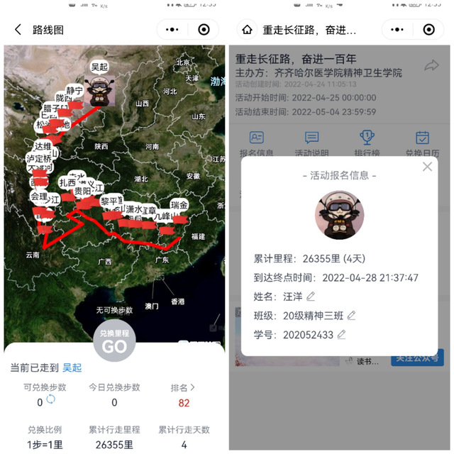 4月25日至5月4日,“重走长征路 奋进一百年”主题活动以微信小程序记步的形式,通过累计步数让同学们体验了红军长征的艰辛,理解了“红军不怕远征难,万水千山只等闲”的革命乐观主义精神,坚定了永远跟党走的理想和信念。
