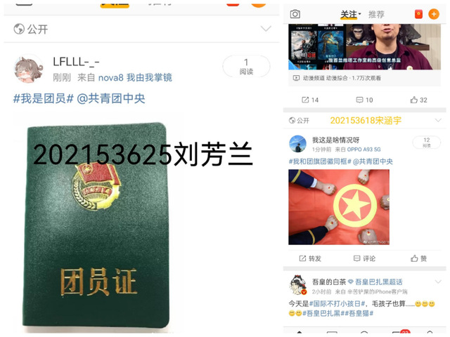 4月30日,“建团百年,秀出精彩”网络话题互动活动,同学们通过发布相关视频、照片、@共青团中央等形式表达了青年学子对共青团的热爱和团组织不负使命的响应。