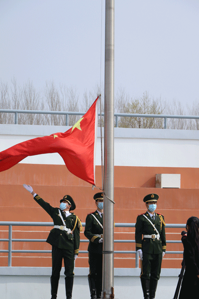 8点整,国旗护卫队迈着整齐的步伐护送国旗进场。随着雄壮的国歌声响起,鲜艳的五星红旗冉冉升起,全体师生面向国旗肃立,高唱国歌。