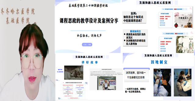 肖薇老师2019年和2020年连续两届获评齐齐哈尔医学院“课程思政”典型案例,有着丰富的“课程思政”教学经验。本次讲座肖薇老师主要从如何在教学中设计“课程思政”,结合案例展示如何在课程中融入思政点,以及“课程思政”实施过程的注意事项三个方面进行交流。肖薇老师通过解读《高等学校课程思政建设指导纲要》,归纳出“课程思政”融入教学的主题方向,并进一步结合具体思政案例介绍如何能如盐融水、润物无声一般将“课程思政”融入到教学设计中。