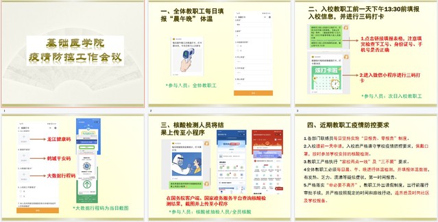 办公室滕迪主任对学院近期教职工疫情防控工作情况进行了通报,对教职工每日入校提前报备、完成三码打卡、晨午晚体温监测、按时参加核酸抽检、严格遵守“家校两点一线”及“三不聚”等工作要求及注意事项,进行了再强调、再部署、再落实。