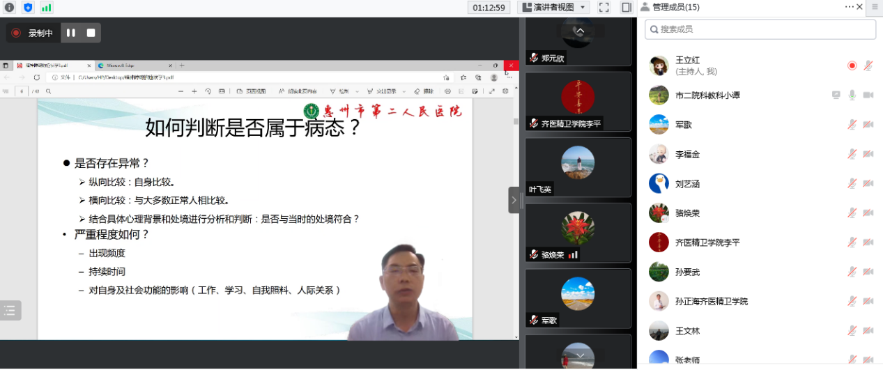 为保证新开辟的精神医学专业实习基地的教学质量,5月18日下午,精神卫生学院组织了惠州市第二人民医院临床教师的试讲考评。试讲考评以线上的形式进行,校级督导专家孙要武教授以及精神卫生学院李平院长、孙正海副院长、督导组专家张丽宏教授、王文林副教授担任专家评委,惠州市第二人民医院张富强书记、黄群明副院长、骆焕荣副院长出席试讲。试讲考评由分管教学工作的孙正海副院长主持。