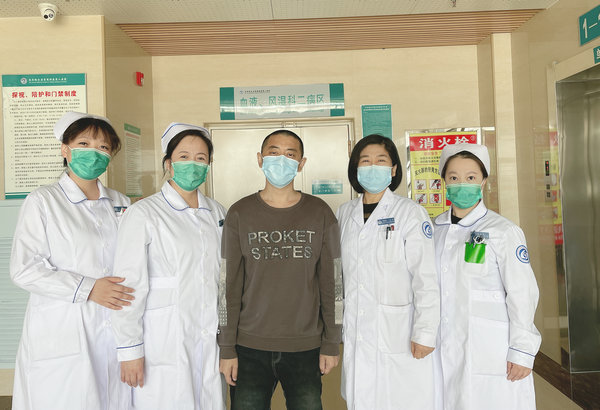 患者苗先生与血液风湿科二病区主任姜丽波、护士长齐颜颜等合影