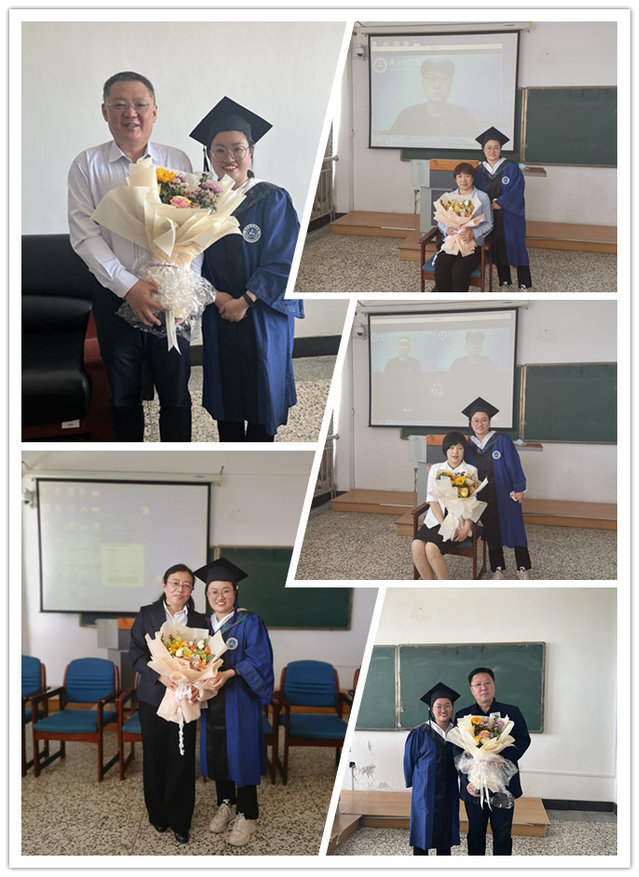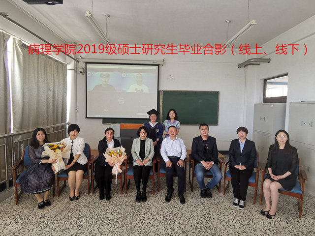 在会议后,由硕士研究生陈培培为代表,为各位导师献花。随后,李兴江院长表示:“三载同行,病理学院见证了你们晨光中的琅琅书声,夜色中的伏案身影,也见证了你们实验成功的惊喜瞬间和论文发表的喜悦时刻。你们留下了青春最美好的回忆,收获了累累硕果,拥有了执着的信念、优良的品德、丰富的知识、过硬的病理技术本领,为前行蓄积了足够的智慧和力量。” 祝福我院三位硕士研究生,希望你们将来能够成为优秀的病理技术人才,齐医病理永远是你们发展的坚强后盾。随后,我院各位领导、研究生导师分别与在校的研究生线下合影、与未在校的研究生云上合影留念。