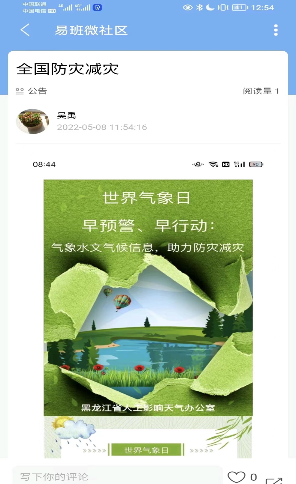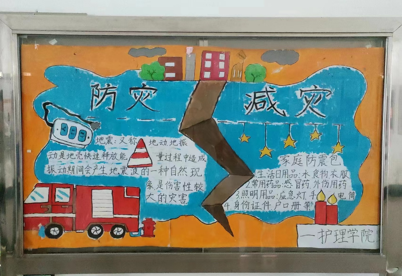 营造宣传氛围:护理学院学生会设计绘画防灾减灾主题板报,张贴于主楼北区宣传栏。同时,在易班发布主题讨论,转发相关科普知识,组织云体验活动,引导同学们更好地认识防灾减灾的重要性。