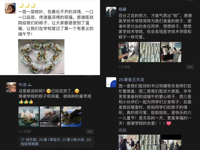 医学技术学院领导们的关怀已在朋友圈、抖音短视频等新媒体账号中纷纷刷屏。“口味佳、心意足,不论甜咸,粽有所爱”,每一个软糯的粽子里皆是满满的心意。学生们青春洋溢的笑容与“端午定制”盒上面“粽子”的图标遥相呼应,“粽”有美好,值得期待!