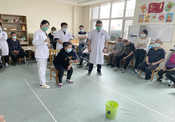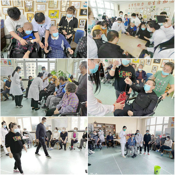 康复医学科副主任胡斌等医护人员与患者共同参与游戏活动