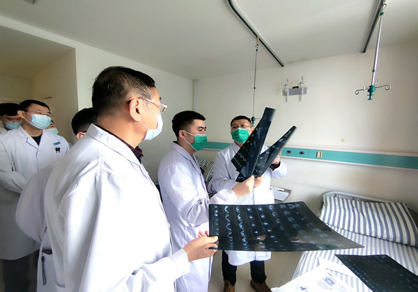 普外科主任王峰(右二)带领团队研讨患者病情