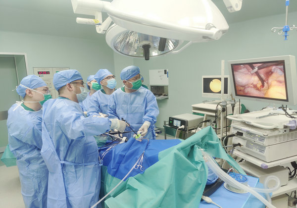 普外科主任王峰(左二)带领普外科团队开展双镜联合微创手术