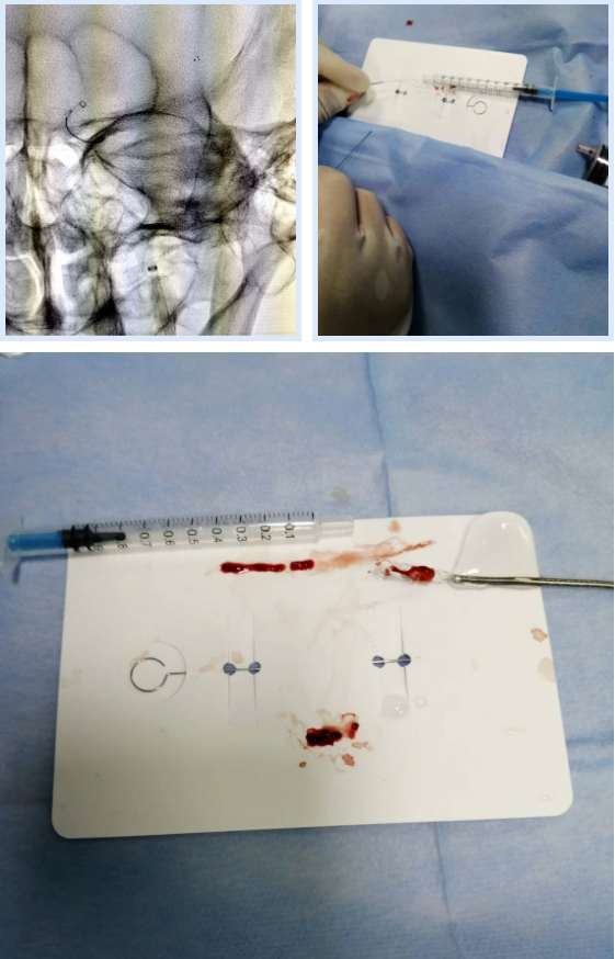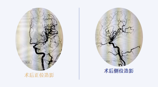 介入科主任刘琳与副主任莫庆国与患者家属交代病情,患者家属同意急诊取栓治疗,经商议后决定行BADDASS治疗,三件套组合:BGC+中间导管+长取栓支架,交换8F动脉鞘,引入BGC:8F×95cm;颅内支持导管:5F*125cm;取栓支架:4mm*30mm至远端病变血管,透视下释放取栓支架至病变血栓处,停留8分钟后取出大量血栓,取栓成功。复查造影见左侧经内动脉、左侧大脑前动脉、左侧大脑中动脉显影正常,血流改善,各分支显影良好,M1段未见明显狭窄,术中复查C臂CT未见颅内出血。术后患者意识清楚,问话对答切题。