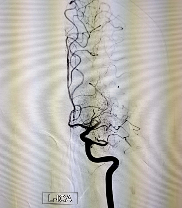该患者男,24岁,体重95公斤,2020年4月患脑梗死病史,经过我院神经内五科治疗未留后遗症。此次患者于2022年5月22日中午12:00出现言语笨拙、右侧肢体无力,右上肢抬起费力,右下肢拖曳,约1分钟缓解,14:00再次出现上述症状,约2分钟缓解,17:00左右再次出现上述症状言语笨拙,右侧上下肢完全不能动,家长电话联系神经内五科主任迟景宏,指示急诊查头部CT及核酸,头部ct未见责任病灶,神经内五科王晓红医生及迟景宏主任查看患者:通过患者病史及入院时患者言语笨拙,右上肢肌力0级,右下肢肌力0-1级,考虑大脑中动脉栓塞,病情危重,迟景宏主任指出患者发病时间小于4.5小时可行溶栓并建议桥接取栓,于18点30分给予阿替普酶溶栓,同时请介入科评估桥接取栓,10分钟后介入科医生查看患者后,建议行脑血管造影检查必要时介入取栓治疗。患者家属同意行脑血管造影检查,王晓红医生迅给患者办理相关手续,并于18点40分前往导管室。19点55分造影结束,术中造影见左侧大脑中动脉M1段闭塞。