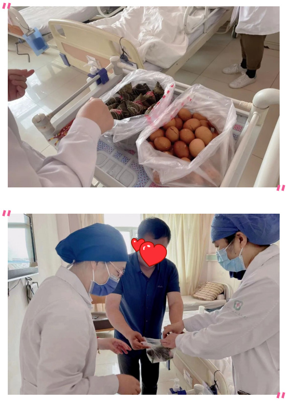由于疫情,病房实行24小时封闭式管理,家属不能探视。又到了一年一度的端午佳节,有好多外地的患者不能与家人团聚,还不能吃上可口的粽子。想到这里,6月3日神经内一科护士长姜继娜端午清晨没有与家人一同去踏青,而是去了早市,为患者及家属准备了香甜的粽子、茶叶蛋及五彩线,与同事一同送到了患者及家属的手上;与患者及陪护说:“今年我们一起过端午,祝愿大家祛病消灾,端午幸福安康!”悠悠粽香意,浓浓医患情,花朝月夕多胜意,岁岁年年长安康。礼物虽小,却包含着最真挚的情谊,祝福虽轻,却寄予了最真诚的关心,疾病是无情的,但医护人员的关爱让患者及家属感受到了医院的温暖。