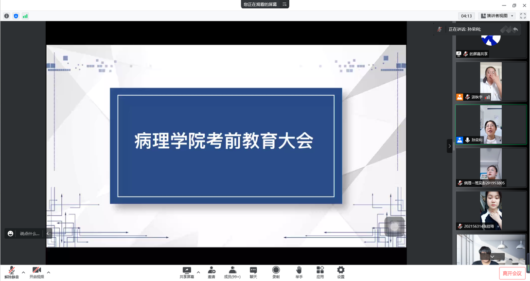 为营造公平、公正、有序、和谐的考试环境,创建良好的考风学风,以诚信考试为荣,以考试舞弊为耻,坚决抵制考试作弊的不良风气,6月8日,病理学院召开考前教育大会。会议采用线上形式,病理学院辅导办和全体学生参加。