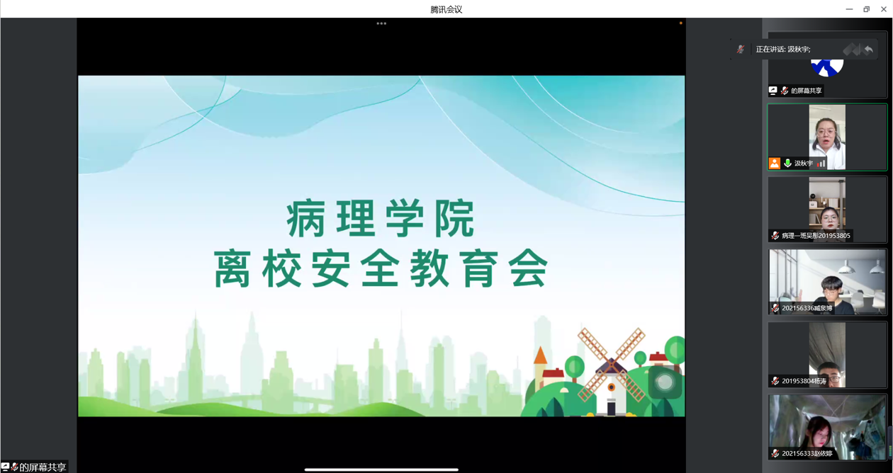 为扎实做好病理学院学生离校安全工作,增强我院学生的安全防范意识,提高自我保护能力,筑牢安全防线。6月8日,病理学院采用线上形式召开了离校安全教育会,病理学院辅导员和全体在校生参加。