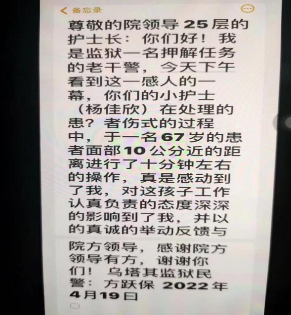 “护士长,你科室这些小护士太好了!服务态度好,随叫随到,这都是你带领的好!我作为一名监狱押解犯人的警察,到过大大小小的各级别医院,你们的服务暖到我了,尤其是杨佳欣,这个孩子,我记住她的名字了。因为我们工作性质特殊,不然我就拍张照片或录个视频了,他给我们这个病人换药那个细致呀!动作轻柔,细致耐心、专注,还不时与患者交流......这是我给她写的感谢信。”一个特殊的患者陪护递过他的手机给我,他是一名监狱押解警察,他说的患者就是一名犯人,看得出这位狱警大哥满心满脸的感动。