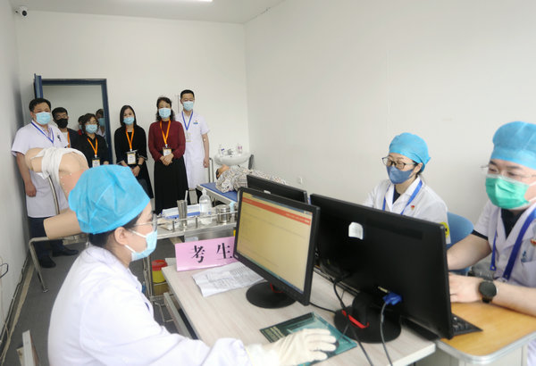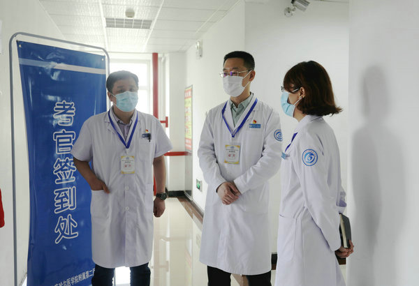 考核采用三站式客观结构化临床考核,分为临床思维考站、接诊病人考站、技能操作考站。由四所国家级基地抽调的38名考官,在同质化考核中给予公平、公正的评分。在考试过程中,考场秩序井然,各个环节衔接紧密,考官履职尽责,考试纪律严明,切实完成防疫工作、考官培训、备用试题安全保密、考务管理、考风考纪、应急预案等几项重点工作,确保考试顺利进行,为广大考生营造了一个安全、和谐的考试环境。