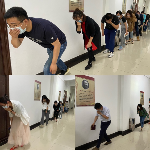 讲座结束后,在李省三主任的带领下,全体教师进行了应急疏散演练,大家俯身捂住口鼻,有序从会议室疏散到教学楼外广场。