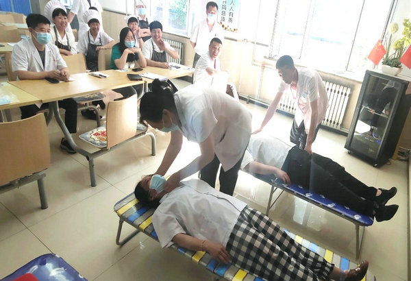 各科室工作人员、学生分别分成小组对心肺复苏术整体救治流程进行了现场演示,重点对心脏按压、清理口腔异物、按压深度、开放气道、人工呼吸、按压频率等要领进行重点学习,确保此次培训活动取得实效。