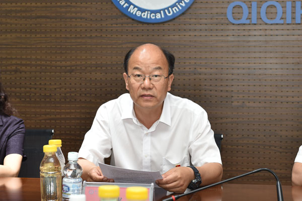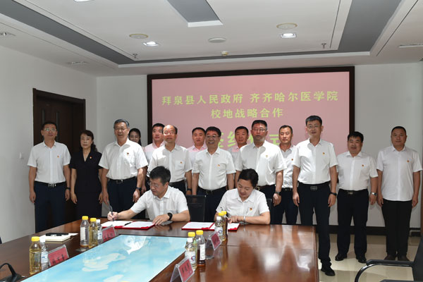 为全面贯彻习近平总书记在深入推进东北振兴座谈会上的重要讲话和对我省重要讲话重要指示批示精神,深入落实省第十三次党代会精神,深化校地合作,充分发挥拜泉县地区优势和学院专业人才优势,7月13日上午,拜泉县委书记荣军率县委常委、组织部长王磊、县政府副县长路宝玲等一行7人来院,与学院共同举办“拜泉县人民政府·齐齐哈尔医学院校地战略合作框架协议签约仪式”。学院党委书记顾长虹,院长方传龙,副院长、党委常委丛明宇、毕红霞、张可勇,党委常委、组织部部长肖锋刚,以及挂职拜泉县干部、相关职能部门代表出席签约仪式。学院党委副书记崔光成主持签约仪式。
