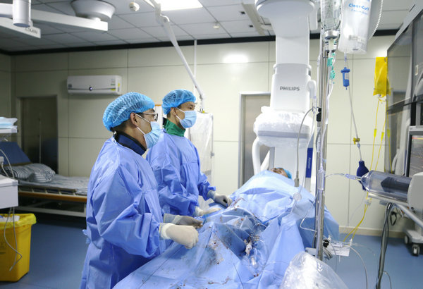 心血管内科三、四病区副主任戚增明(右)、李景瑞为患者行经皮冠状动脉旋磨术治疗+球囊扩张术+支架术