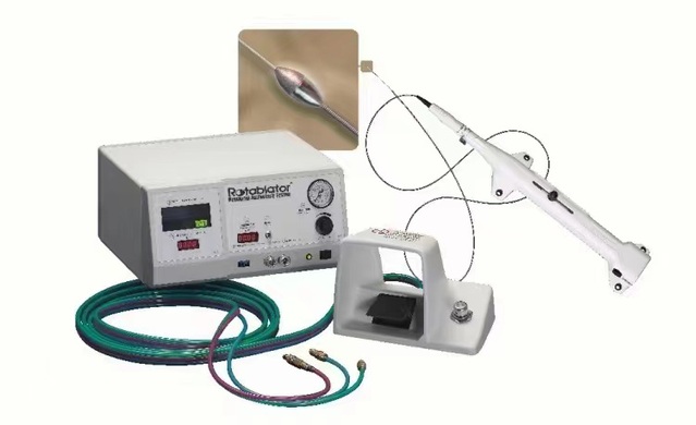 冠状动脉旋磨术是采用呈橄榄型的带有钻石颗粒旋磨头,根据“差异切割”原理选择性地祛除纤维化或钙化的动脉硬化斑块,而具有弹性的血管组织在高速旋转的旋磨头通过时