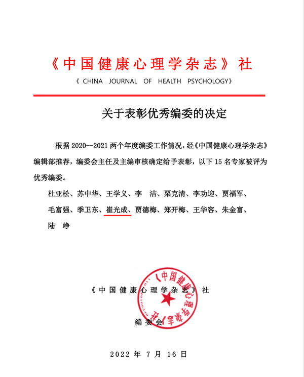近日,《中国健康心理学杂志》编委会根据2020-2021两个年度编委工作情况,决定给予长期从事编审工作的15位专家优秀编委称号,学院党委副书记崔光成教授获此殊荣。