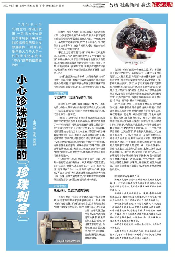 7月29日,记者走访了我市多家品牌饮品店,发现珍珠奶茶仍然是店里的热销饮品,随即记者购买了一杯珍珠奶茶,对饮品店配套的吸管以及奶茶中的“珍珠”利用专业卡尺进行了测量。经初步测量,奶茶吸管的内径约为1.1cm左右,而奶茶中的珍珠直径约为0.8—1cm,由此可见,在吸食珍珠奶茶时,奶茶里的“珍珠”恰好刚刚可以通过吸管被吸入口中,但经常饮用珍珠奶茶的市民会有这样一种体验,当用吸管吸食奶茶时,经常会发生“珍珠”排队堵住吸管的情况,这时,大多数人都会采取用力一吸将“珍珠”如数吸入口中的方法,殊不知,这种方法就很可能出现意外。