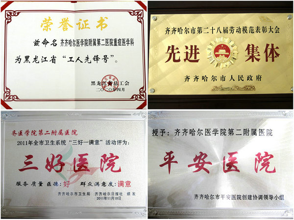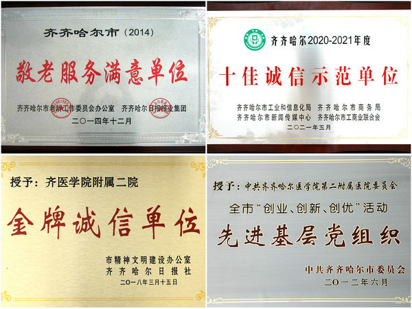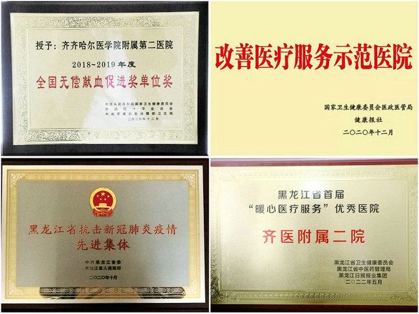 医院先后被授予2018-2019年度全国无偿献血促进奖(单位奖)、黑龙江省抗击新冠肺炎疫情先进集体、抗疫急诊先进集体、全市卫生系统支援奉献单位、无偿献血公益爱心单位、市三八红旗集体、市诚信标兵单位、市优秀五四红旗团委等。职工先后当选全国抗击新冠肺炎疫情先进个人、全国卫生系统先进工作者、全国卫生健康系统新冠肺炎疫情防控先进个人、“中国好医生、中国好护士”特别抗疫人物、省抗击新冠疫情先进个人、省优秀共产党员,省第三届最美护士、全省第八届道德模范、黑龙江省五一劳动奖章、援汉医疗队武汉五一劳动奖章,省第八届道德模范、省龙江好人,省教育系统师德先进个人、省第二届最美医生提名奖、市战疫先锋、新时代最美鹤城人、首届鹤城诚信之星、鹤城道德楷模等。