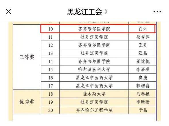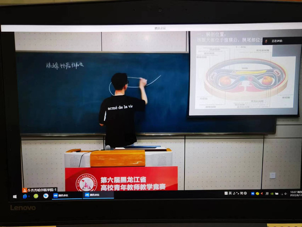 我院影像教研室白天老师代表医学院参加医科组别竞赛,为了能在竞赛中取得好成绩,影像教研室蔡庆斌主任带领全体教师利用业余时间反复研读竞赛规则,全体教师精诚合作,与白天老师一同制定参赛方案,细化每一个细节并且全程对其进行指导把关。白天老师一遍一遍地修改PPT、完善教学设计各个环节,精益求精,模拟竞赛场景反复演练,最终功夫不负有心人,白天老师在第六届黑龙江省高校青年教师教学竞赛中取得医科组第10名,荣获三等奖(其中一等奖3名,二等奖6名,三等奖8名,优秀奖3名),位列所有参赛附属医院的榜首。