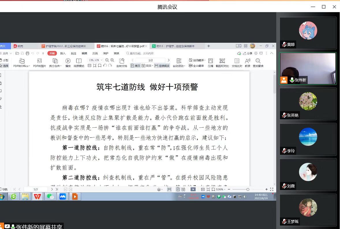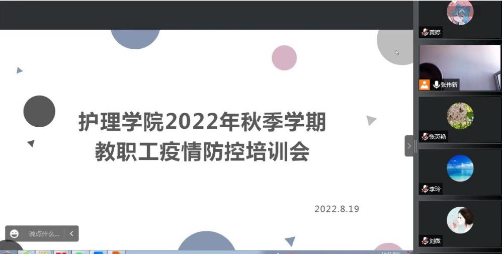 为了切实提升院疫情防控工作水平,护理学院于8月19日下午在腾讯会议平台召开2022年秋季学期教职工疫情防控培训会。会议由护理学院院长高音主持,全体教职工参会。