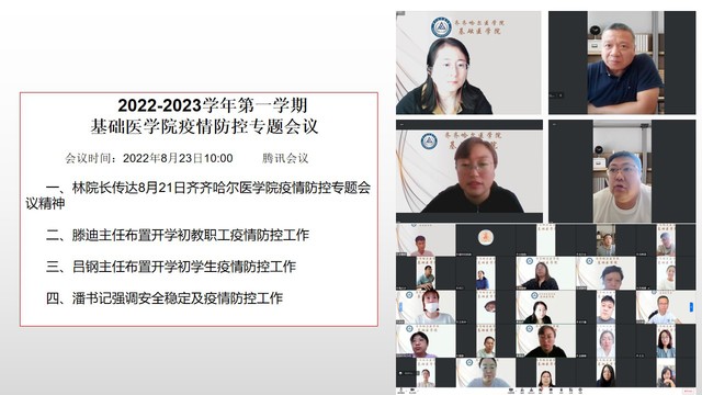 8月23日上午基础医学院组织召开了“疫情防控专题会议”,全体教职工参会,会议由林岩院长主持。会上,林岩院长详细传达了齐齐哈尔医学院8月21日疫情防控会议精神,提出要提高政治站位,不折不扣认真完成学校疫情防控各项要求;压实疫情防控主体责任,各科室负责人要亲自抓、亲自管;要精准掌握师生返校信息,同时做好新生报到准备工作。办公室滕迪主任对开学初教职工的各项疫情防控政策及要求做了周密布置。辅导办吕钢主任对新学期学生返校的疫情防控工作以及学生返校后管理与服务工作做了细致安排。最后,潘洪明书记强调,疫情防控工作要与重点工作同安排、同部署、同落实;要高度重视安全稳定与意识形态工作,确保在二十大前学院始终保持安全平稳状态。