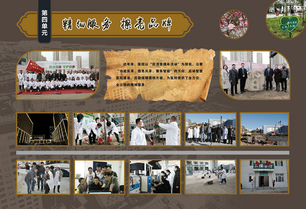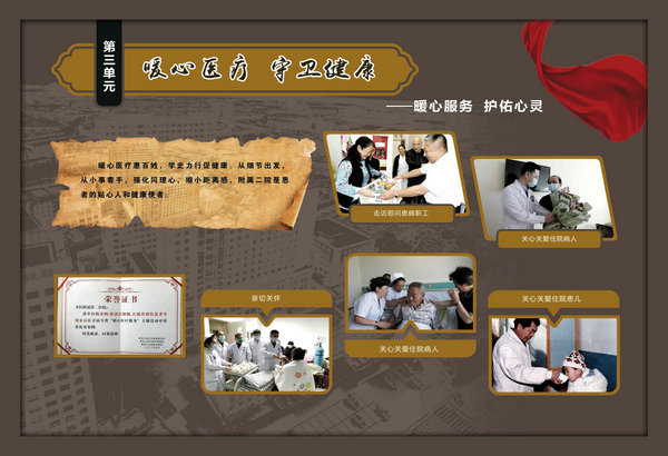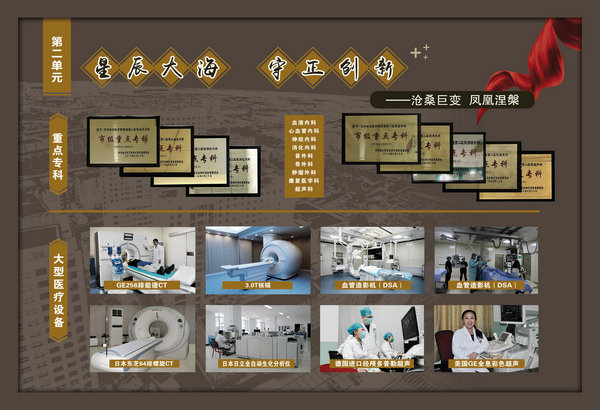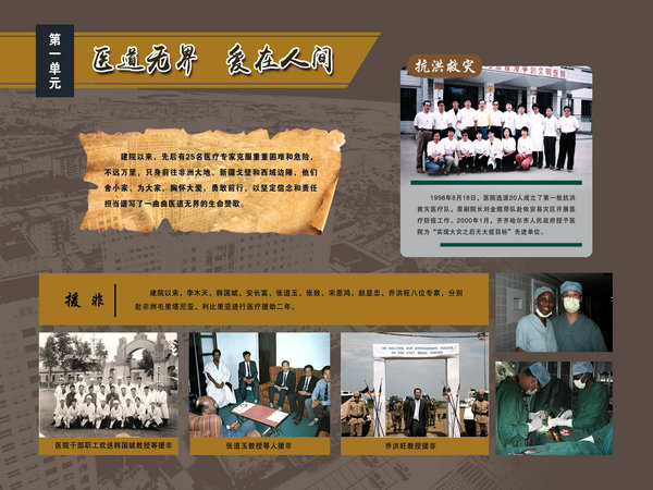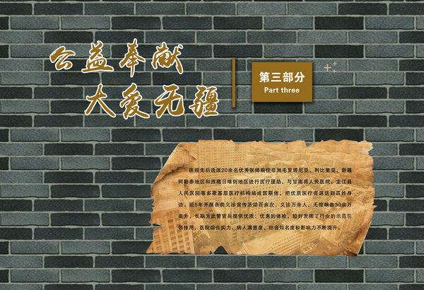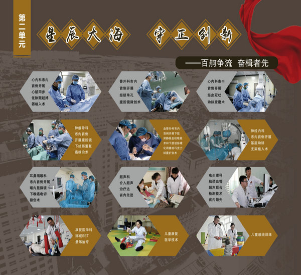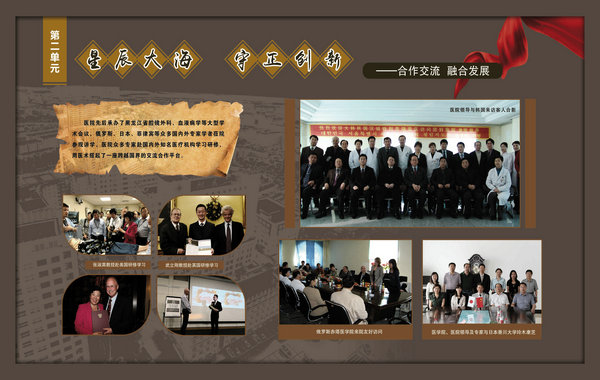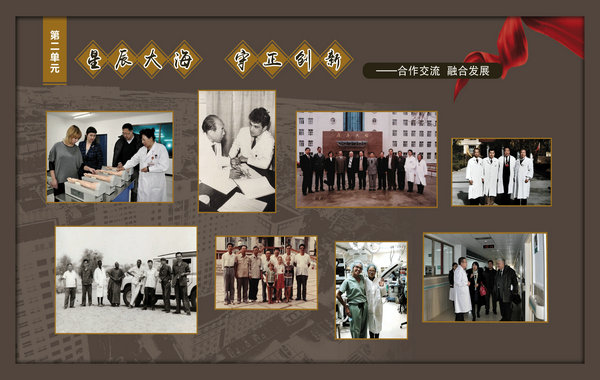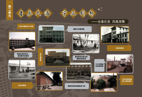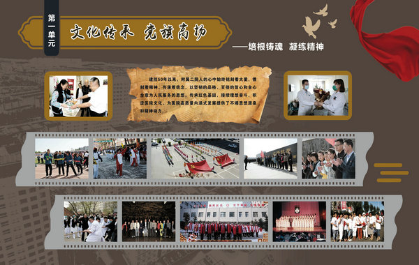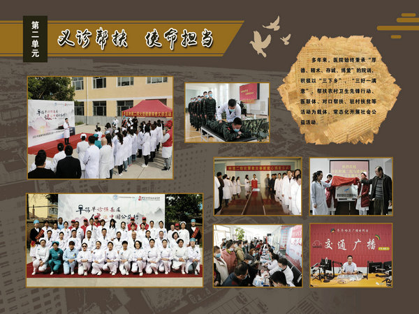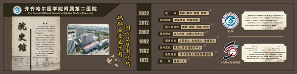 医院院史馆坐落在内外科病房楼二楼连廊处,由东西墙面44块展板组成,内容包括序厅和正厅两大部分。序厅由医院Logo和建馆宗旨等元素组成;正厅由前言、50春秋 风华正茂、大医精诚 广济苍生、公益奉献 大爱无疆、结束语五部分组成。院史馆通过系列图文展示,客观详实记录了医院50年的发展历程,见证了医院50年取得的辉煌成就。