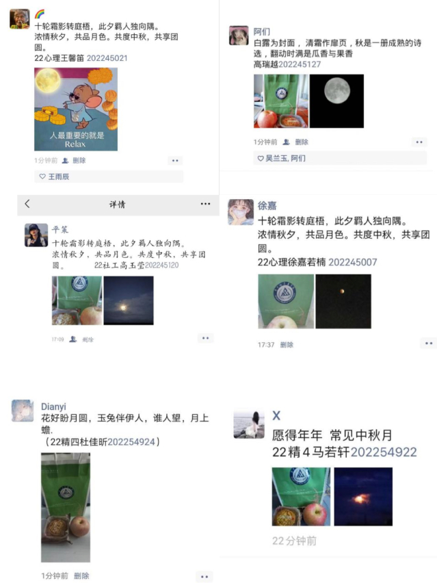 9月10日,正值中秋佳节,为了弘扬中华民族优秀传统文化,丰富同学们的校园生活,营造中秋氛围,共享美好生活,精神卫生学院举办了“浓情秋夕,共品月色”线上主题活动。“十轮霜影转庭梧,此夕羁人独向隅。未必素娥无怅恨,玉蟾清冷桂花孤”,随时静态管理下的校园,同学们仍利用微信朋友圈分享着喜度佳节的欢悦,在分享学校党委和教师关爱的同时,也寄语同学、朋友、亲人中秋快乐,“明月相照,千里线上团圆”。