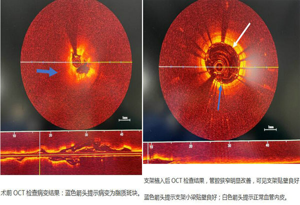 吴晓杰主任介绍,冠脉造影为二维平面图像,可以明确冠脉有无狭窄,但无法了解血管内的三维情况,OCT是一种应用近红外线对血管进行横断成像的血管内成像技术,被认为是目前检测冠脉病变最清晰的辅助检查手段。
