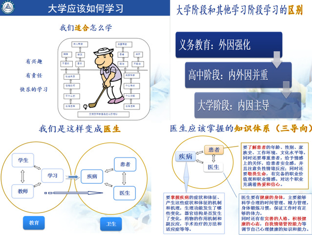 通过系列讲座,可以让新生对大学生活进行有效规划,告诉学生要有兴趣、有责任、快乐的学习。在学习中不断的摸索、反思、修正,最终找到那款最适合自己的学习方法。嘱托新生们尽快适应大学生活,制定生涯规划,做一个善于学习的新型医学专业人次,努力实现自己的人生梦想。