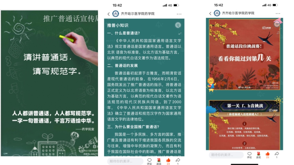 开展线上宣传活动。通过“齐齐哈尔医学院药学院美篇”发布推普小知识,普及了什么是普通话、普通话的发展、为什么要全国推广普通话、推广普通话与保护方言是否冲突等知识,发布“普通话段位挑战赛!看看你能过到第几关”趣味挑战赛,师生积极参与挑战。