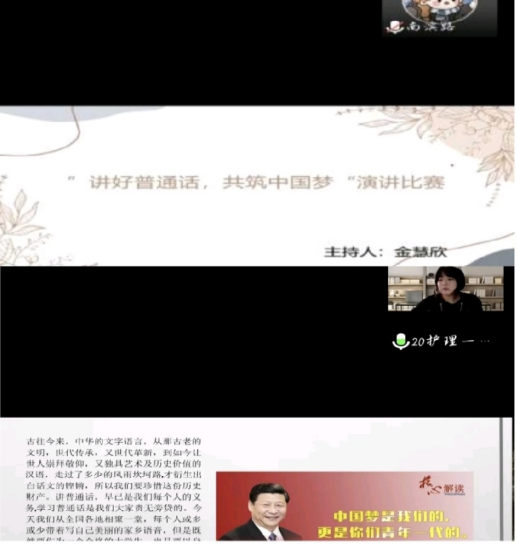 9月14日,护理学院开展的“推广普通话,共筑中国梦”演讲活动在腾讯会议拉开序幕。24名参赛同学用标准的普通话讲述了对汉语言文字的热爱,通过自己精彩的演讲,诠释了对普通话推广工作的热爱。“手拉手说普通话,心连心做中国人”,24名同学以宣传员的角色,号召全院同学主动说普通话、用规范字,增强同学们的历史责任感和民族复兴使命感。