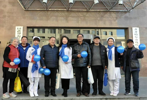 刘春(左四)等与内分泌科一病区主任张健等医护人员合影留念